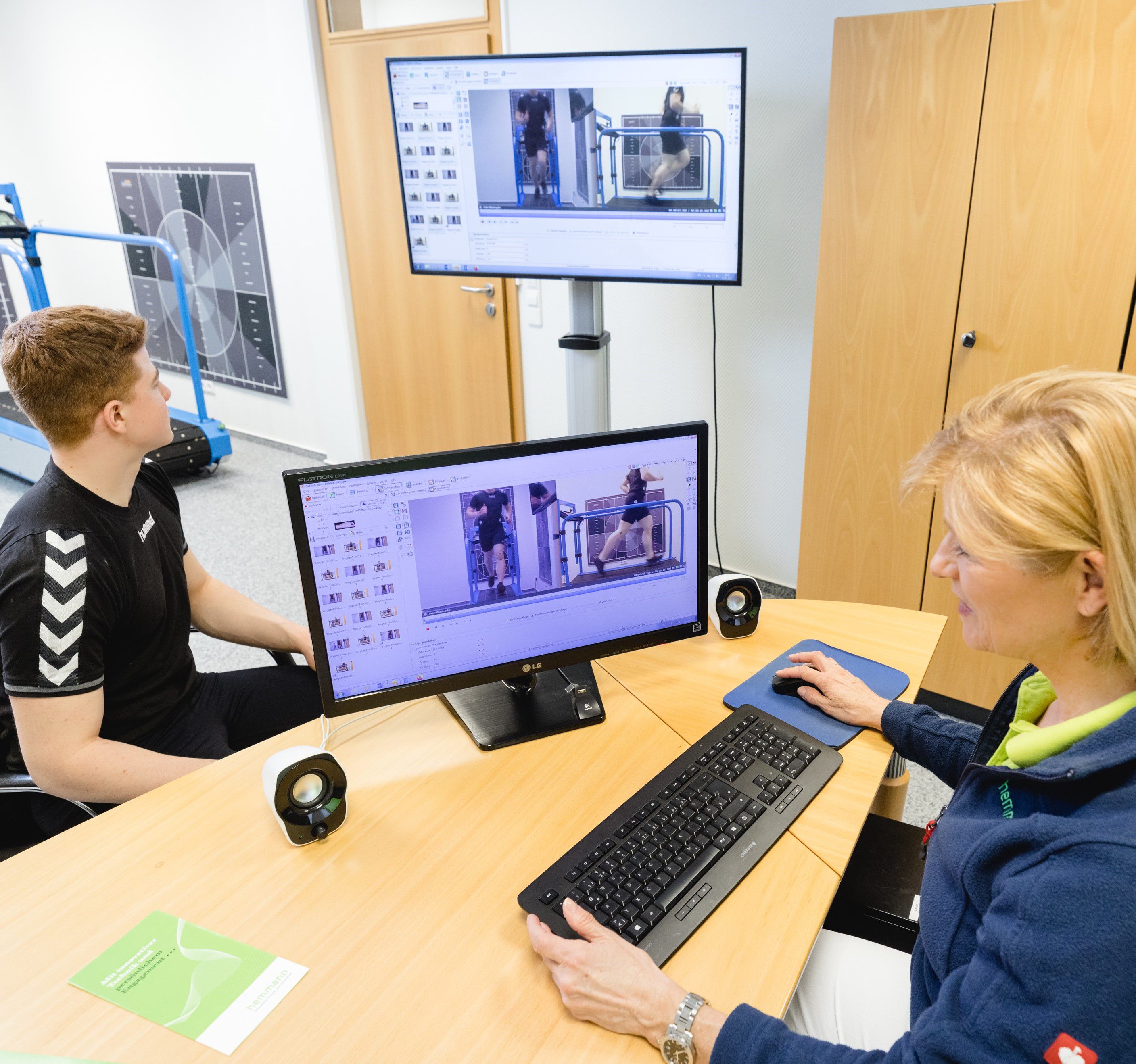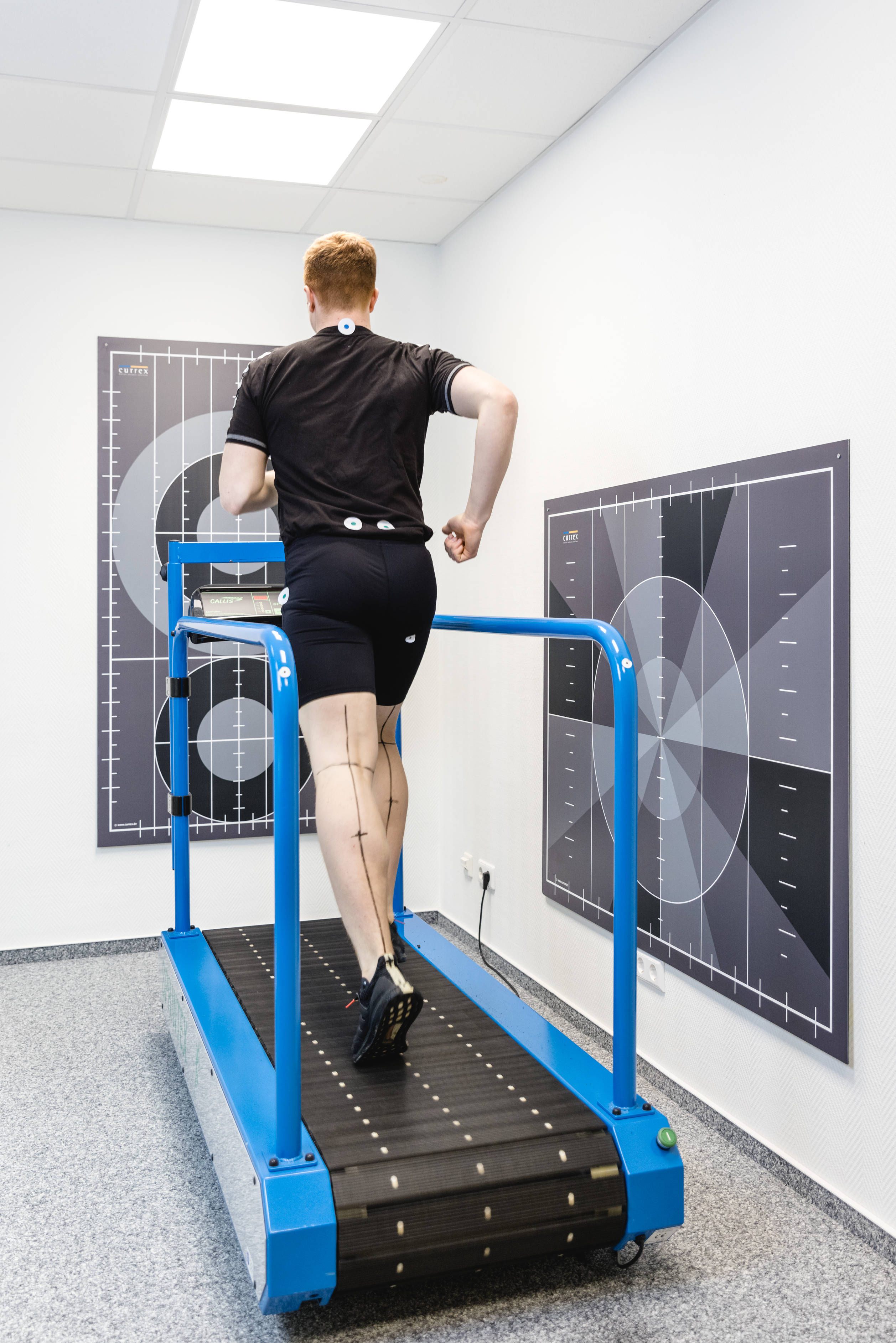 In unserem Studio für Bewegungsanalysen beobachten wir das Zusammenwirken des gesamten Bewegungsapparats. Denn jeder Schritt des Fußes beeinflusst über das Sprunggelenk nicht nur das Knie bis zu Becken, Hüfte und Lendenwirbel, sondern strahlt bis in die Schultern und die Halswirbelsäule aus. Wir markieren Ihre Beine und filmen Sie auf dem Laufband aus unterschiedlichen Perspektiven.